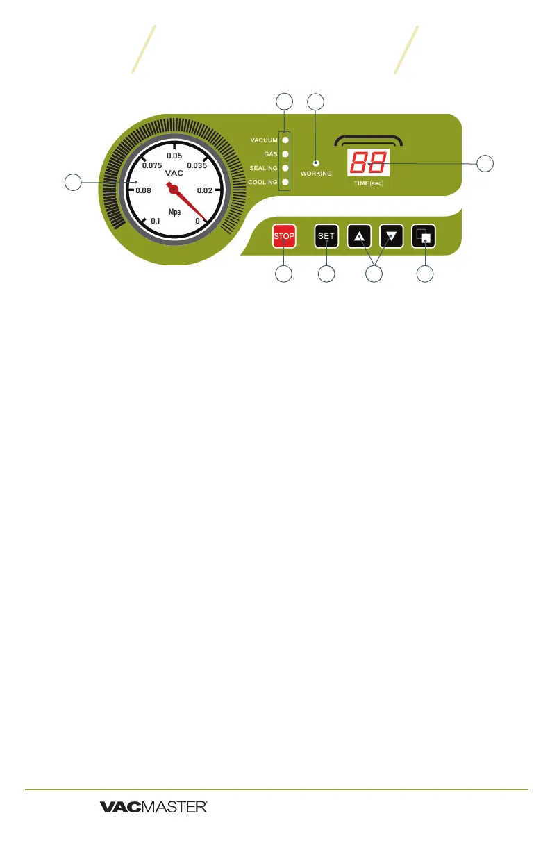 5. STOP Button - Press to stop the cycle and immediately seal the