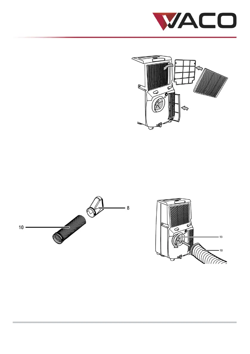 1. Podłącz okienną dyszę wylotową (8) do jednego końca rury odprowadzającej powietrza