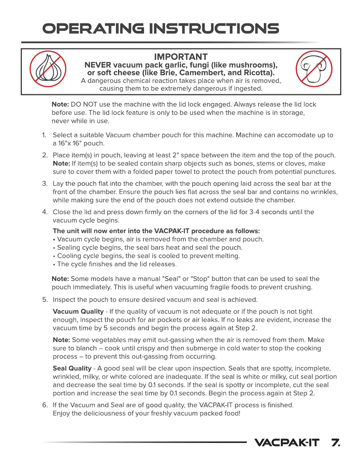 VacPak-It 186VMC16F - Operating Instructions; General Operating Procedure; Vacuum and Seal Quality Checks