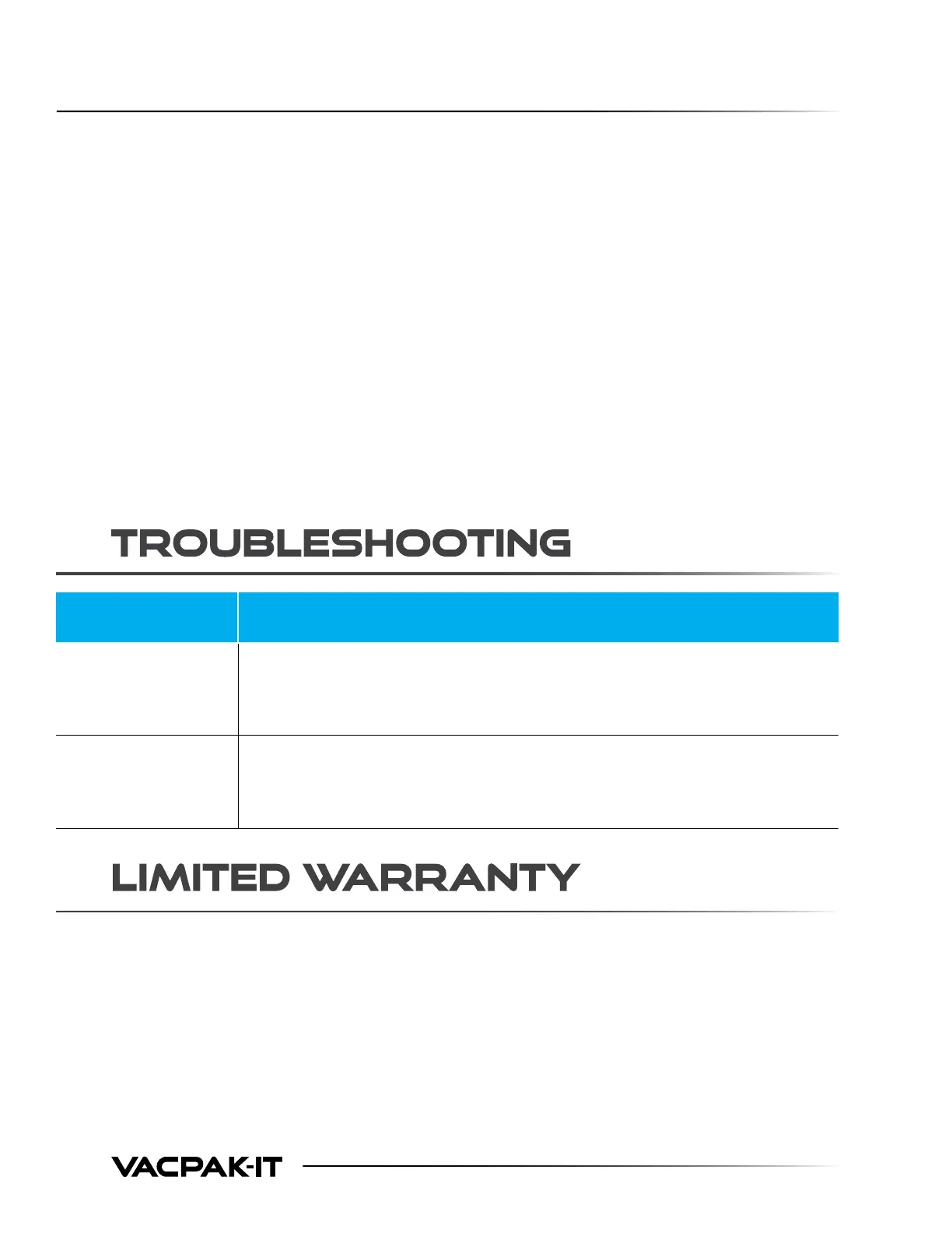 unauthorized service agencies voids this warranty. This warranty explicitly does not apply to, and VACPAK-