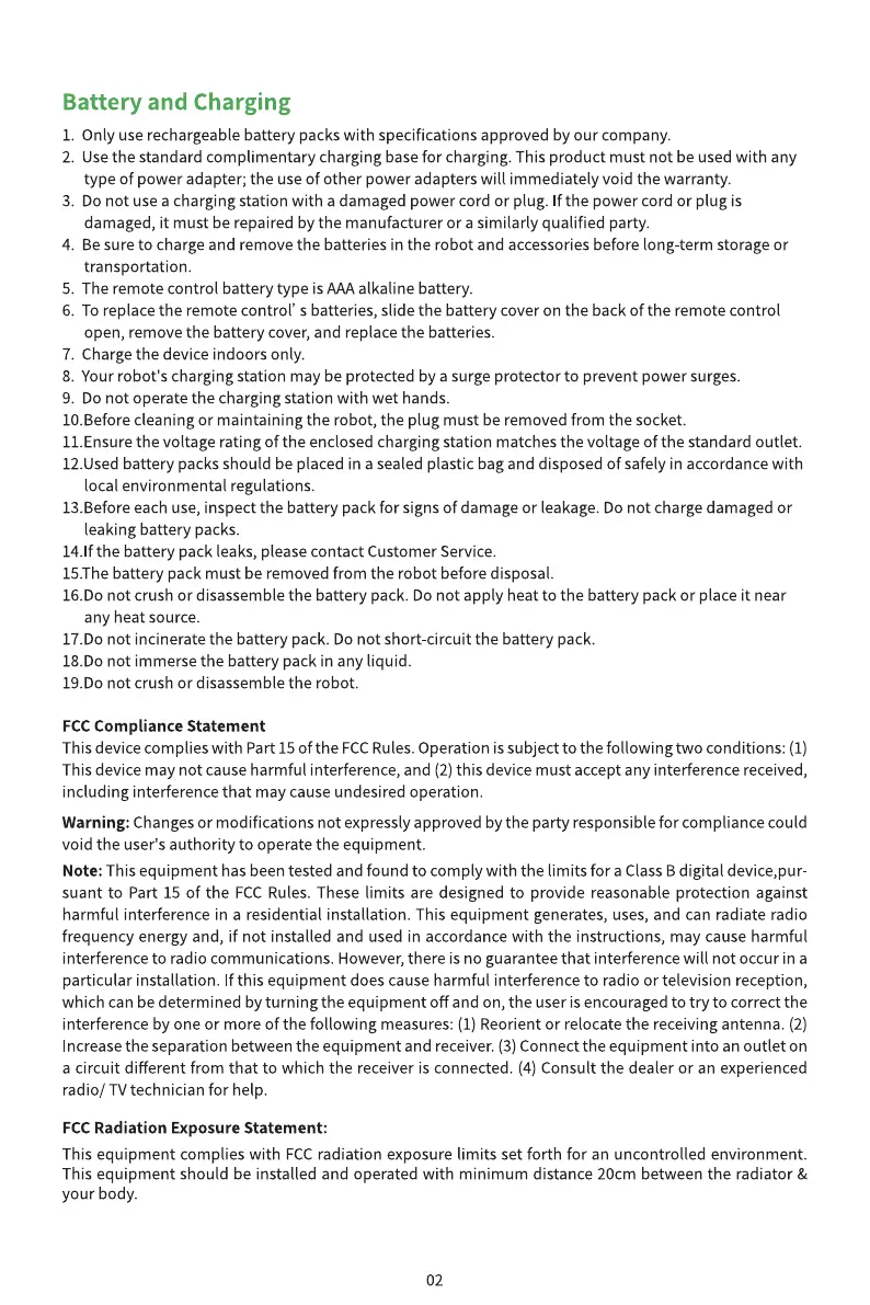 15.The battery pack must be removed from the robot before disposal.