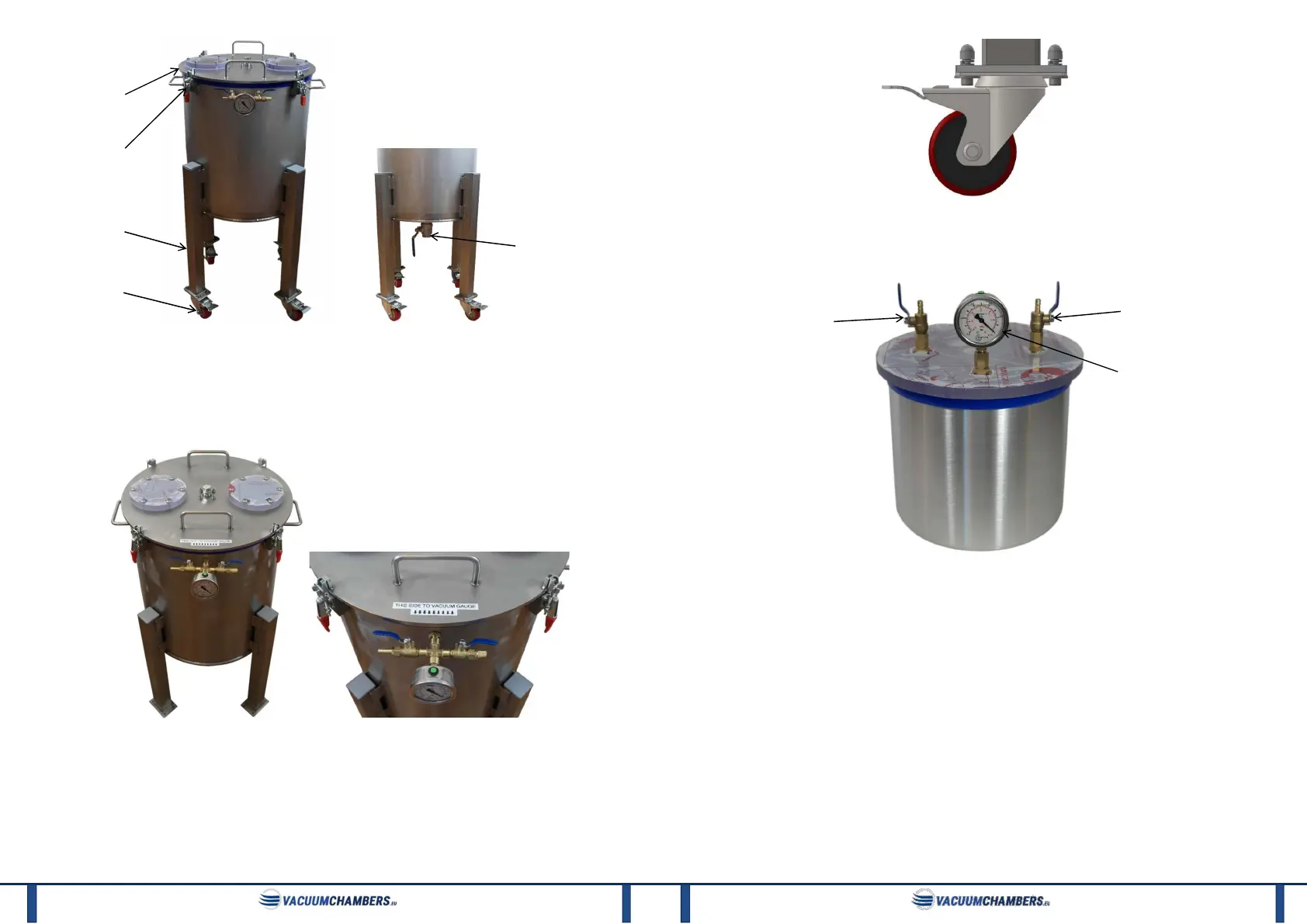 The legs (3) and the castors (4) makes possible to move the chamber and to place a container under the tank. The clamps