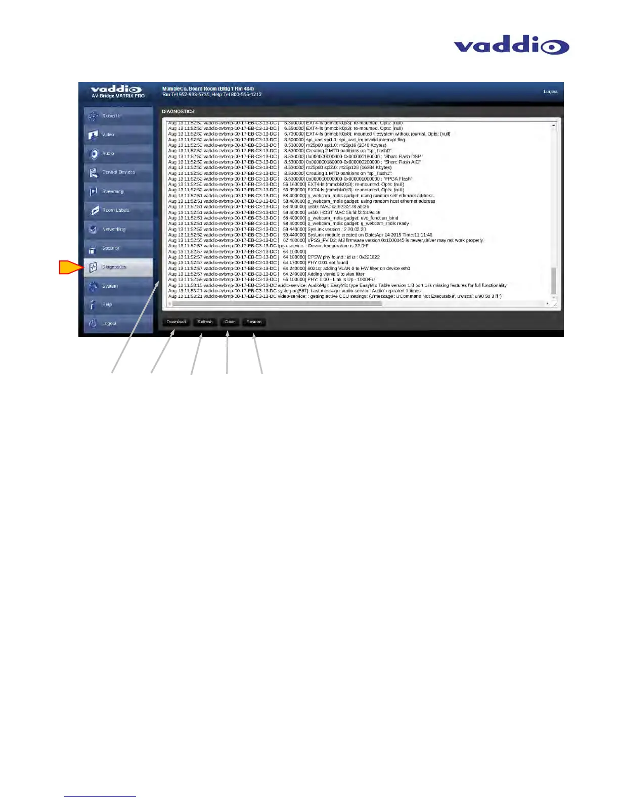 Diagnostics: The Diagnostics screen will monitor and log function and code history of the AV Bridge MATRIX PRO. This