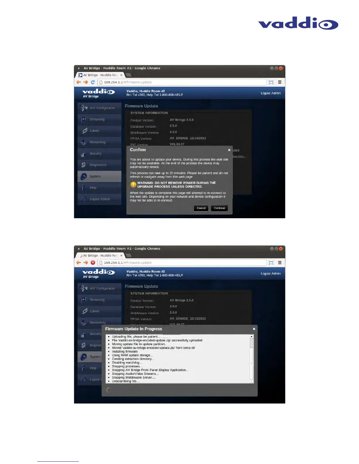 VADDIO AV Bridge - Firmware Update Process Guidance; Firmware Update Confirmation and Progress Screens