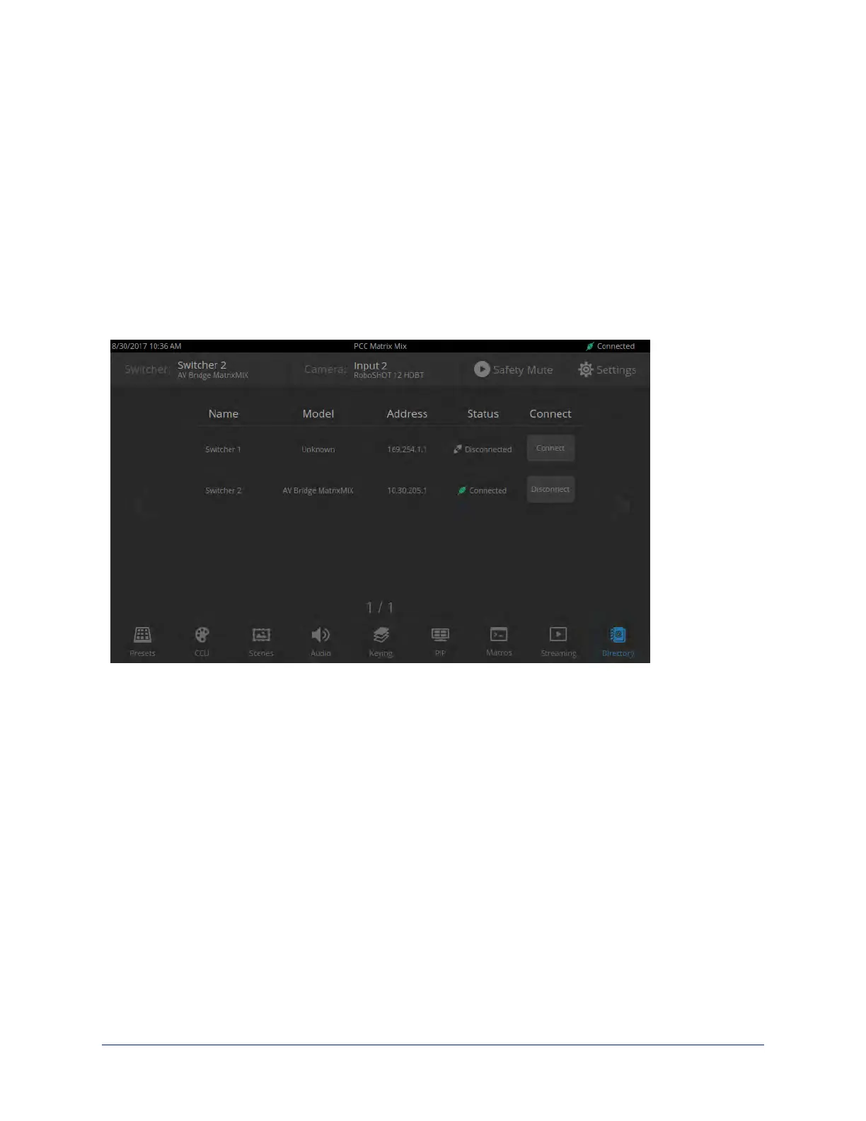 On the Directory screen, tap the Connect button associated with the switcher if its status is Disconnected.