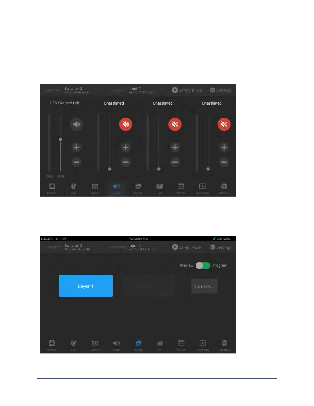 The audio channels available on the Audio screen depend on how the connected switcher is configured.