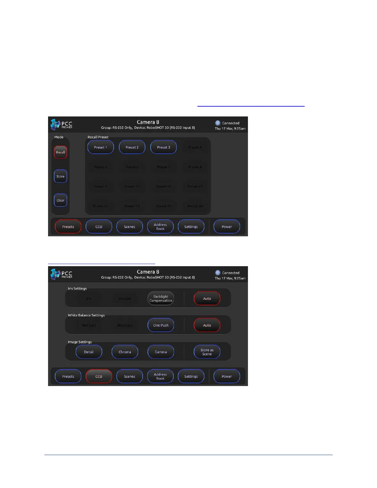 CCU screen – Adjust lighting and color (CCU) settings and store adjustments as CCU scenes. See