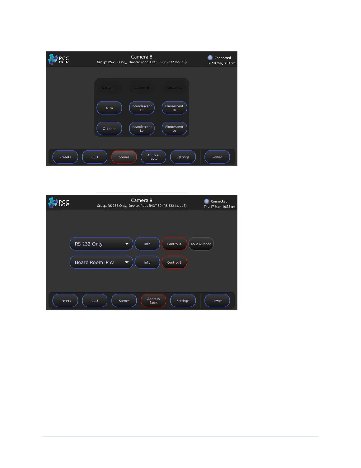 Scenes screen Choose lighting and color adjustments (CCU scenes) defined for the selected camera.