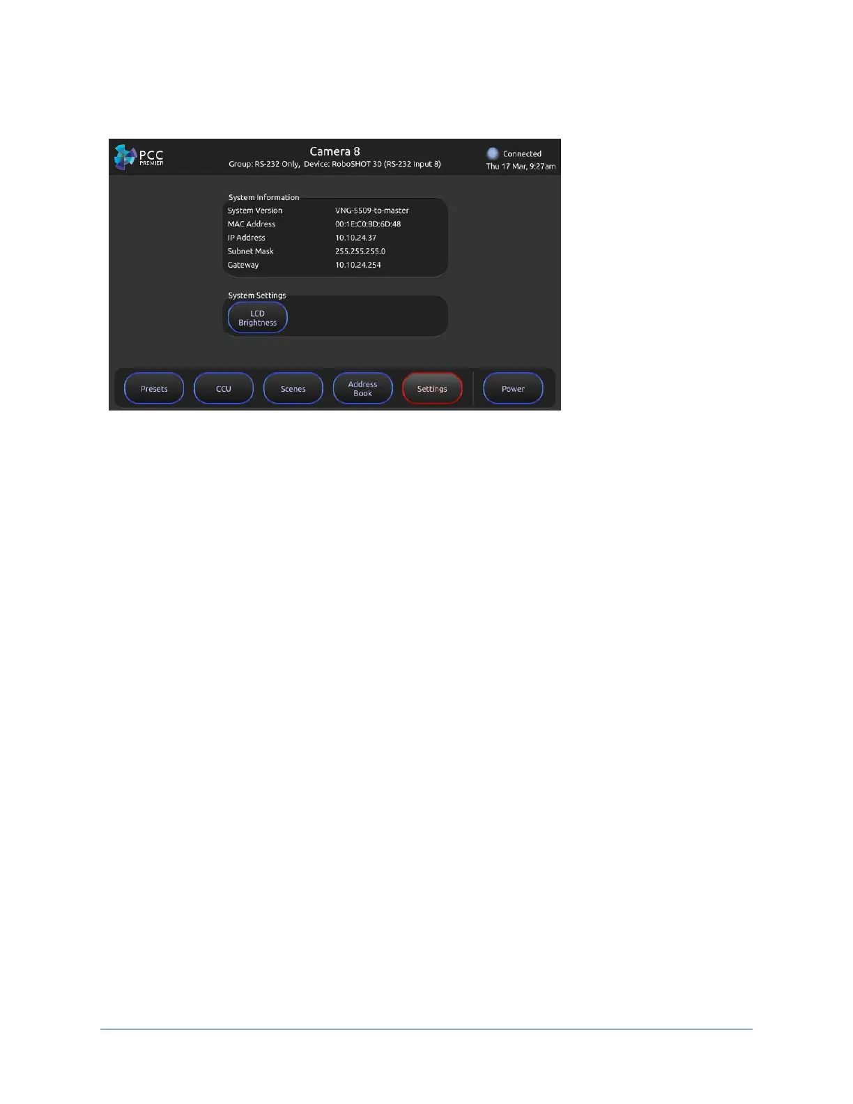 Settings screen – View firmware and network information for the camera controller, and set the brightness