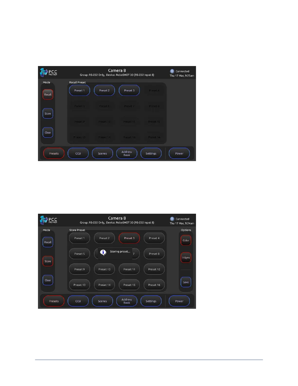 selected camera, and can write presets to the camera.