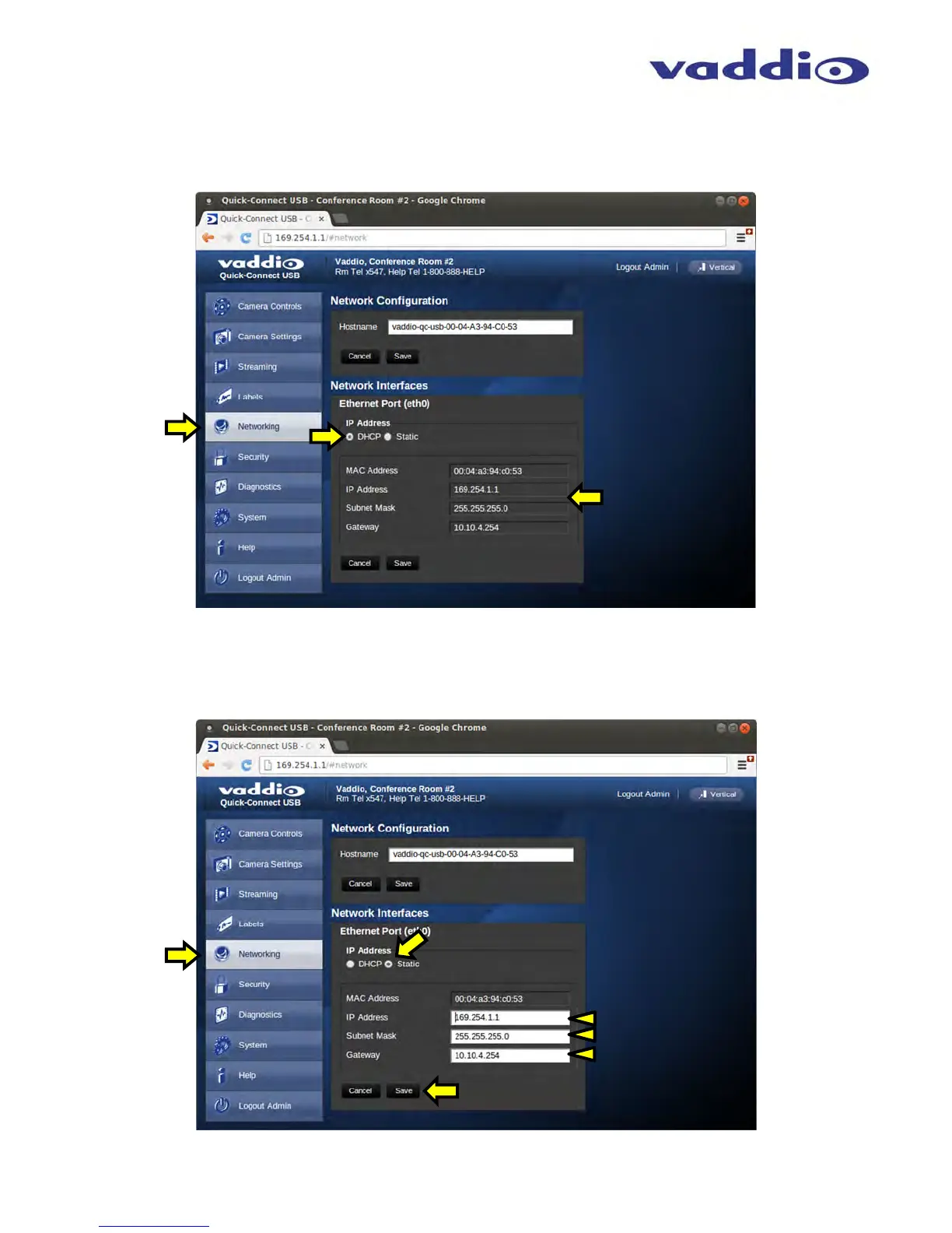 If Static IP is used, the IP Address, Subnet Mask and Gateway are manually entered. Click on Save to keep the