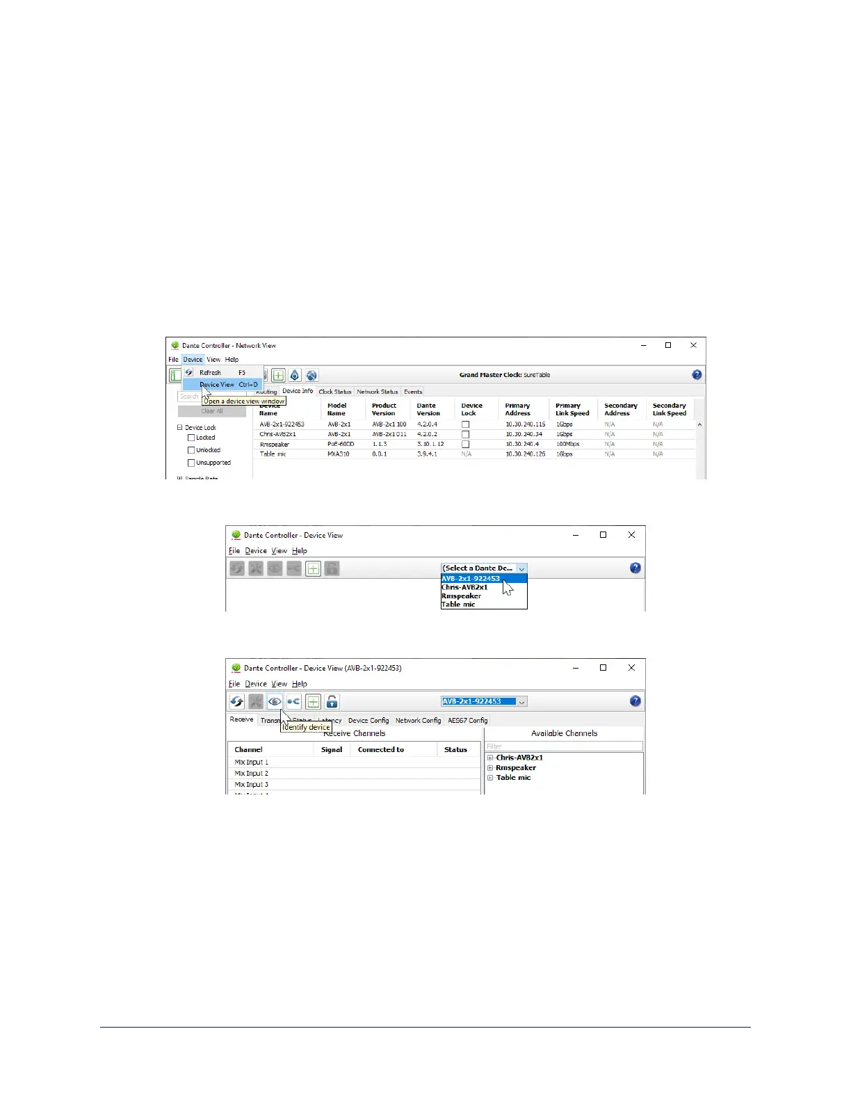 1. Open the Device Info tab to see the IP address and other information about each Dante device on the
