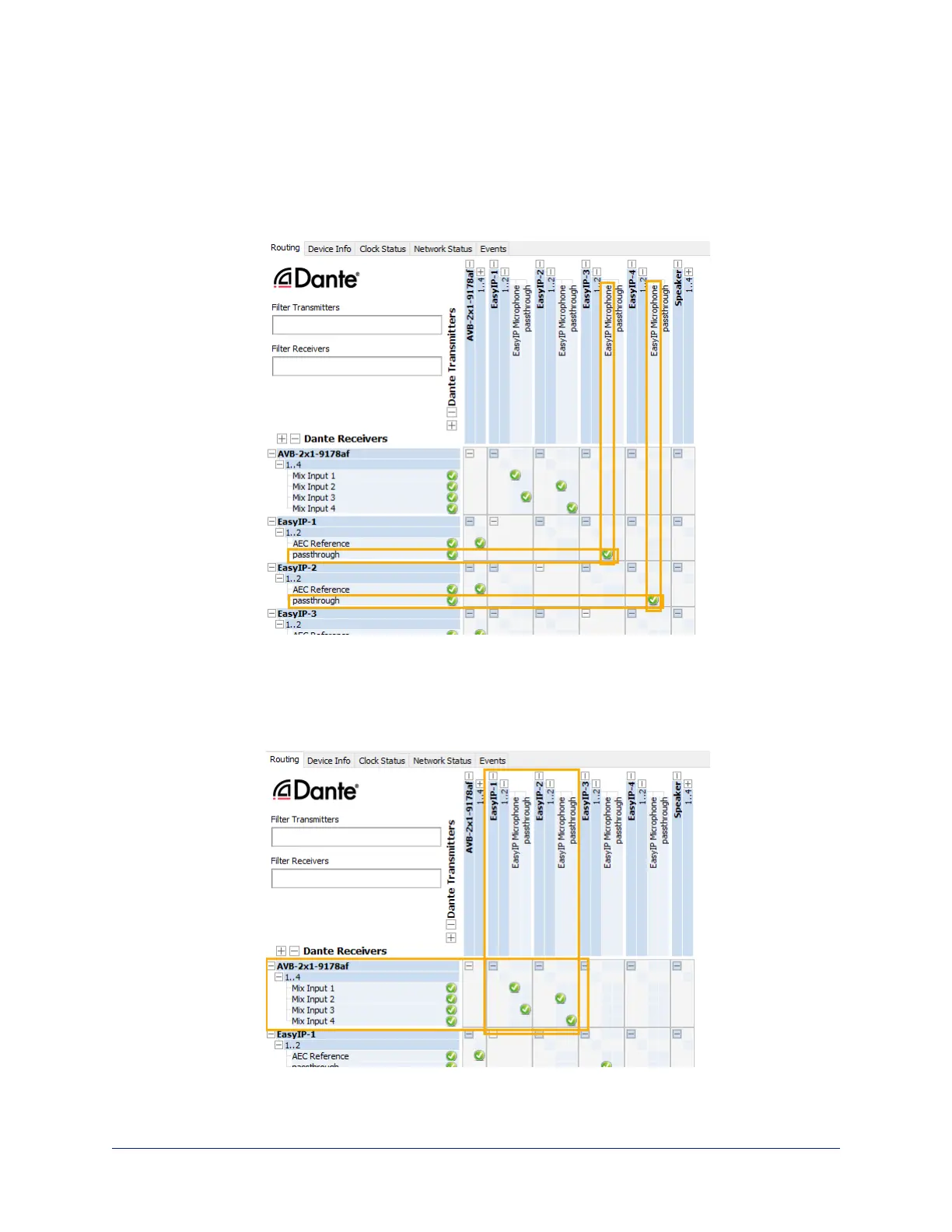 2. In the Network View, look under Dante Receivers to find the passthrough row for each of these two