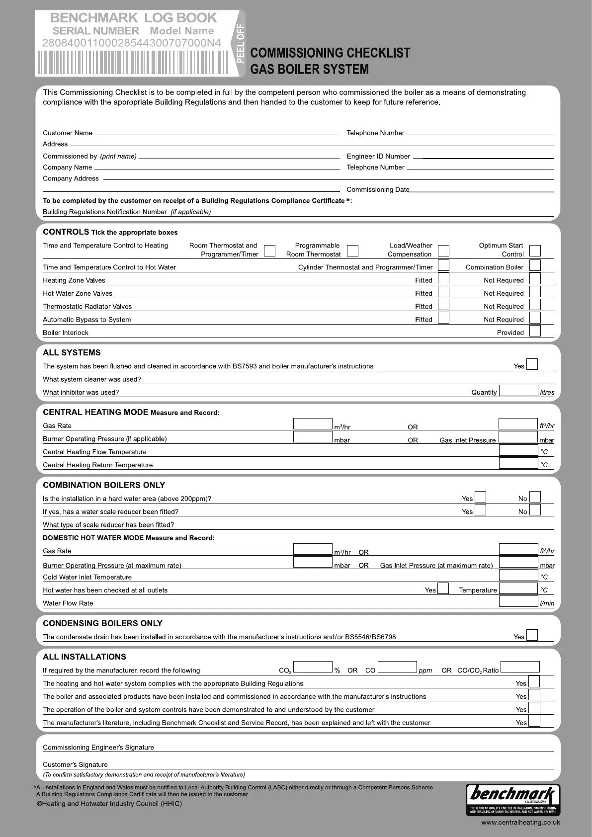 Failure to install and commission according to the manufacturer’s instructions and complete this Benchmark Commissioning Checklist will invalidate the warranty.