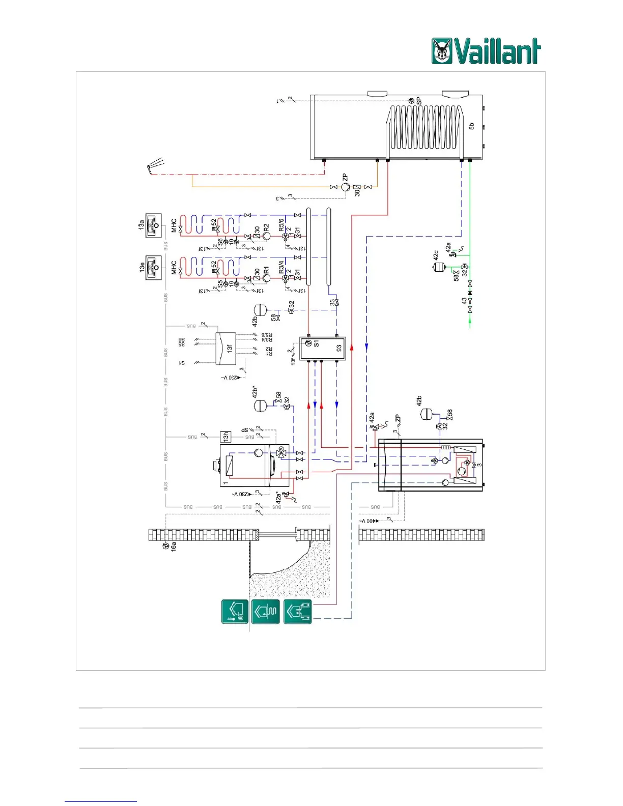 This system diagram does not contain all of the cut-off and safety devices required for correct installation. Comply with the