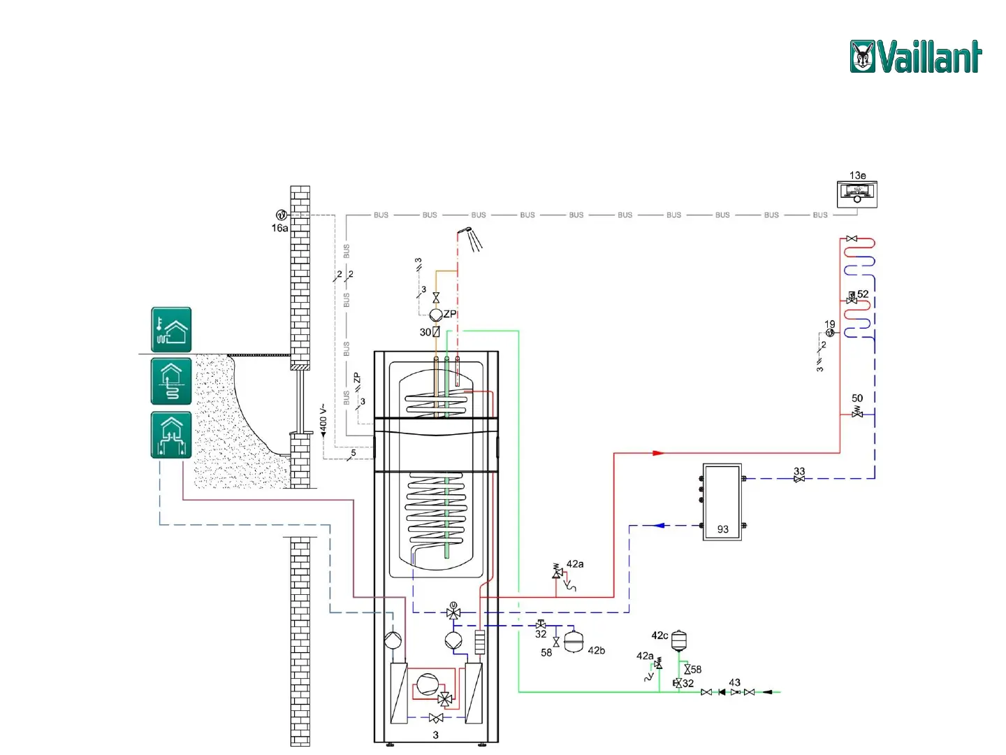 Vaillant multiMATIC 700 - System Diagram 8; Standard heat pump system, auxiliary heater requires pump of heat pump, monoenergy