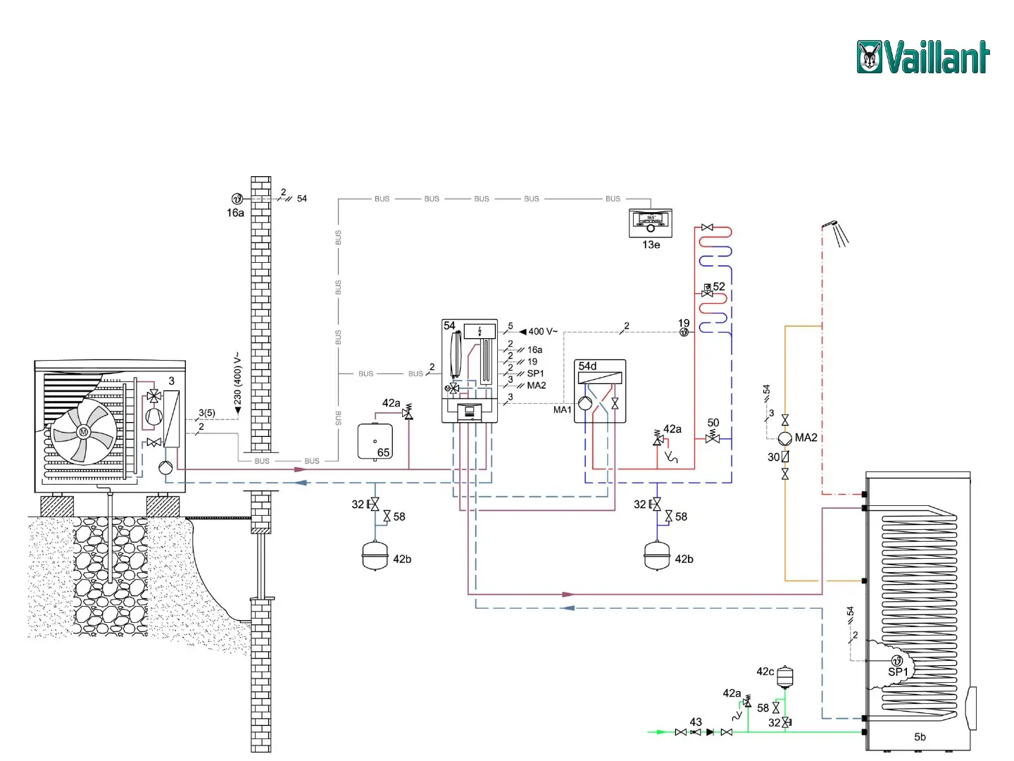 Vaillant multiMATIC 700 - System Diagram 11; Standard heat pump system with heat exchanger, auxiliary heater requires pump of heat pump, mono-energy