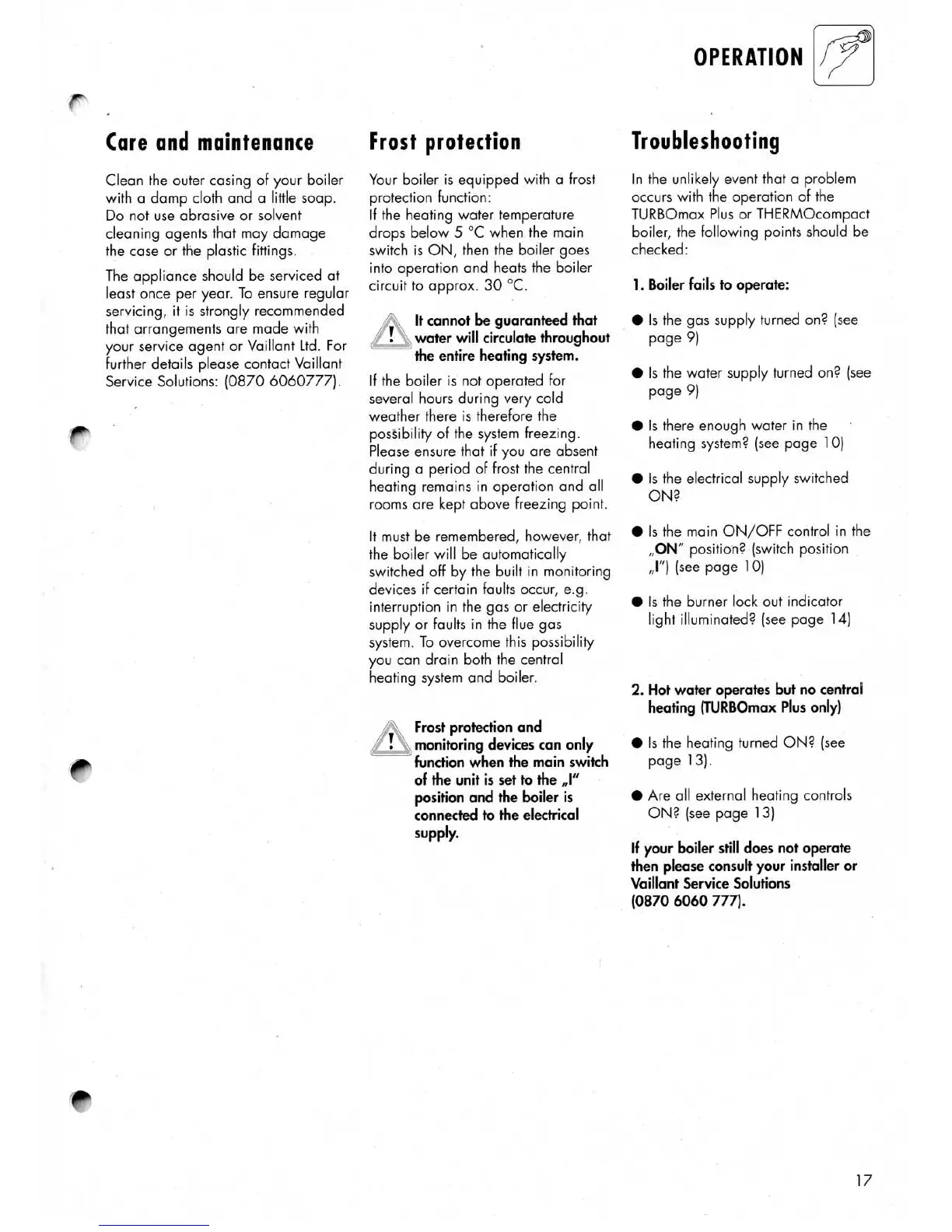 Vaillant Turbomax Plus 824 E - Care and Maintenance; Frost Protection Function; Troubleshooting Common Issues