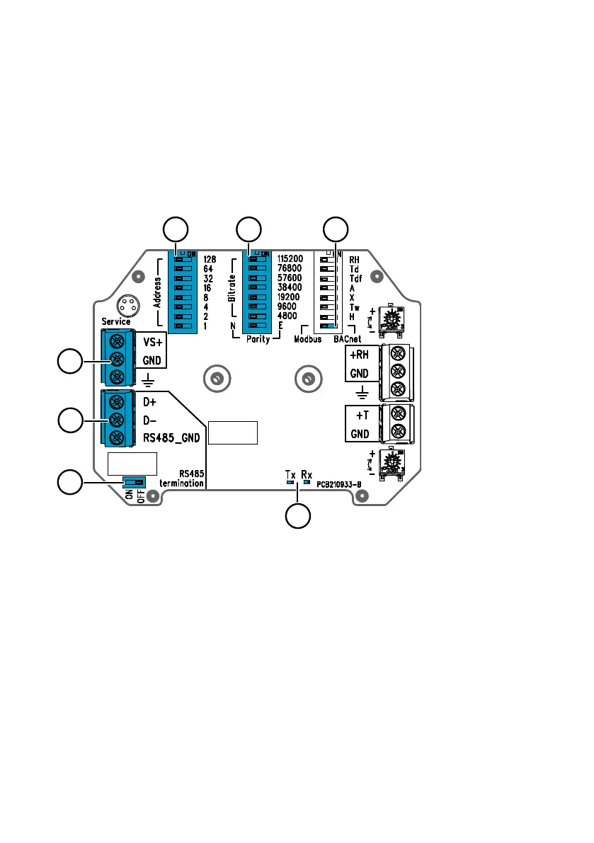 5 DIP switches for setting the communication bitrate (4800 … 115200 bps) and parity (N/E)