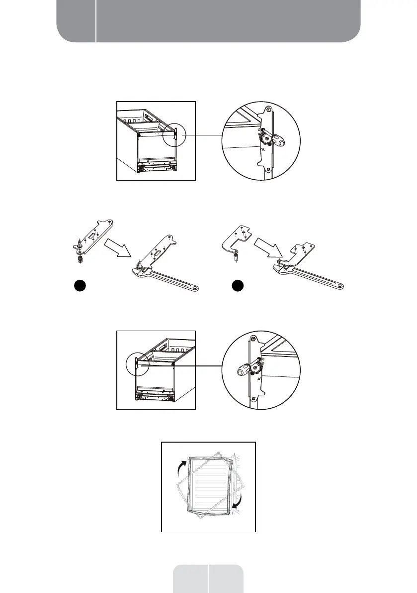 6. Install the lower hinge under to the refrigerator like below, screwing in the adjusting feet, make