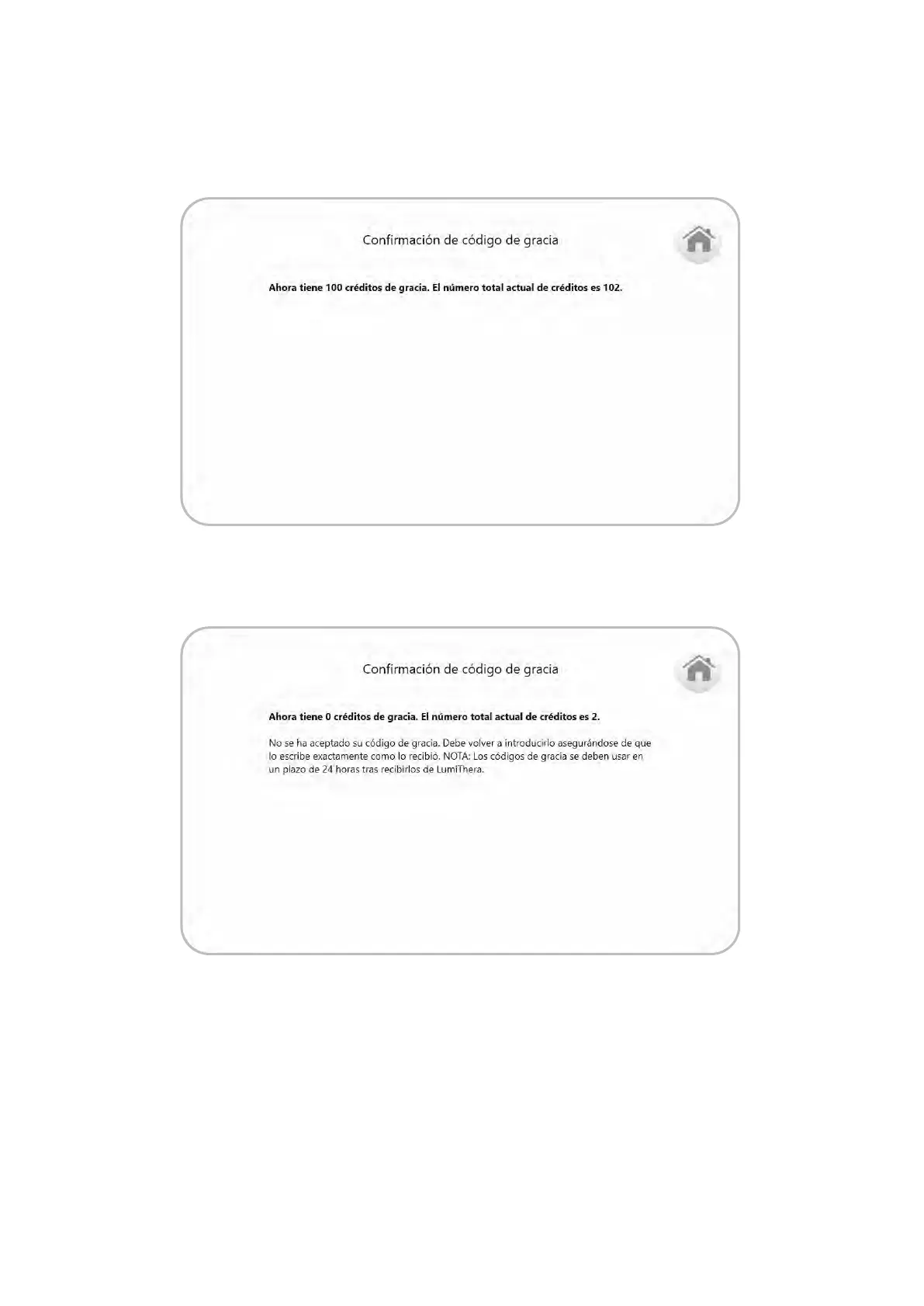 Si se acepta el código del periodo de gracia, se visualizará una pantalla de confirmación con