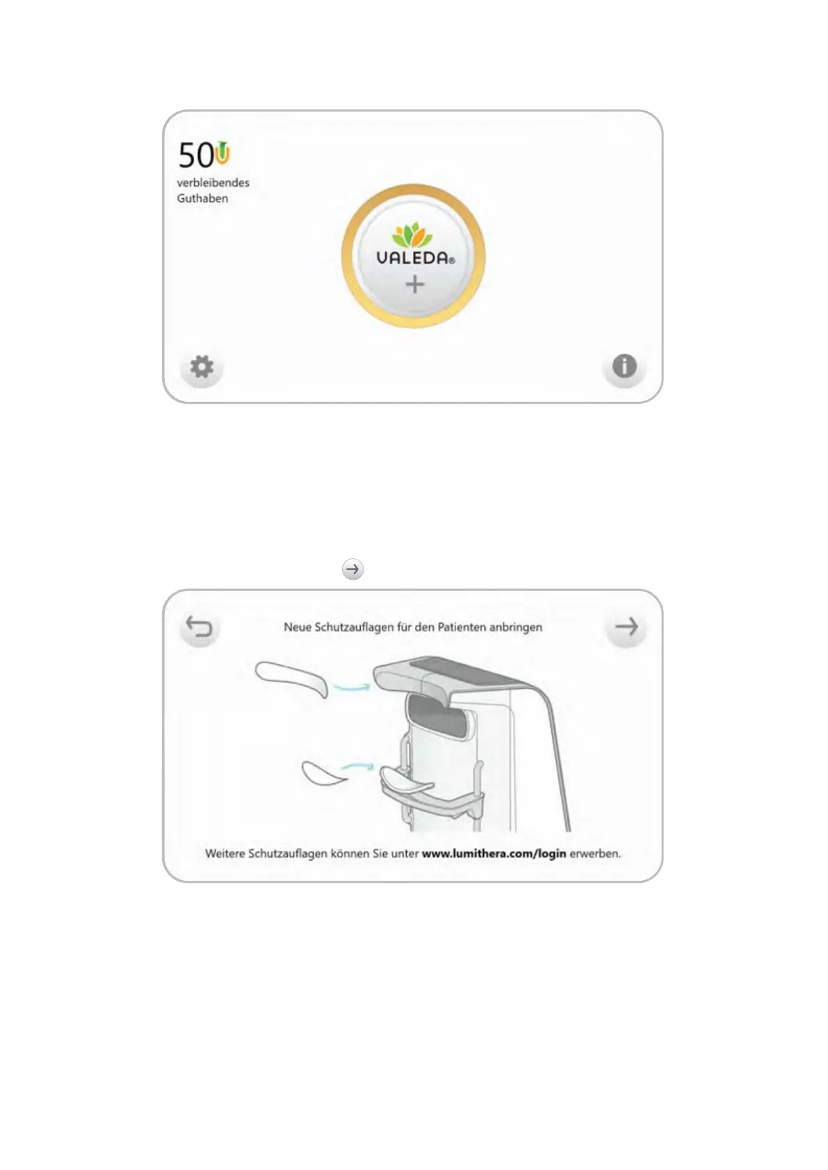 Auf dem nächsten Bildschirm wird die Anleitung für das Anbringen der Einweg-Schutzauflagen für