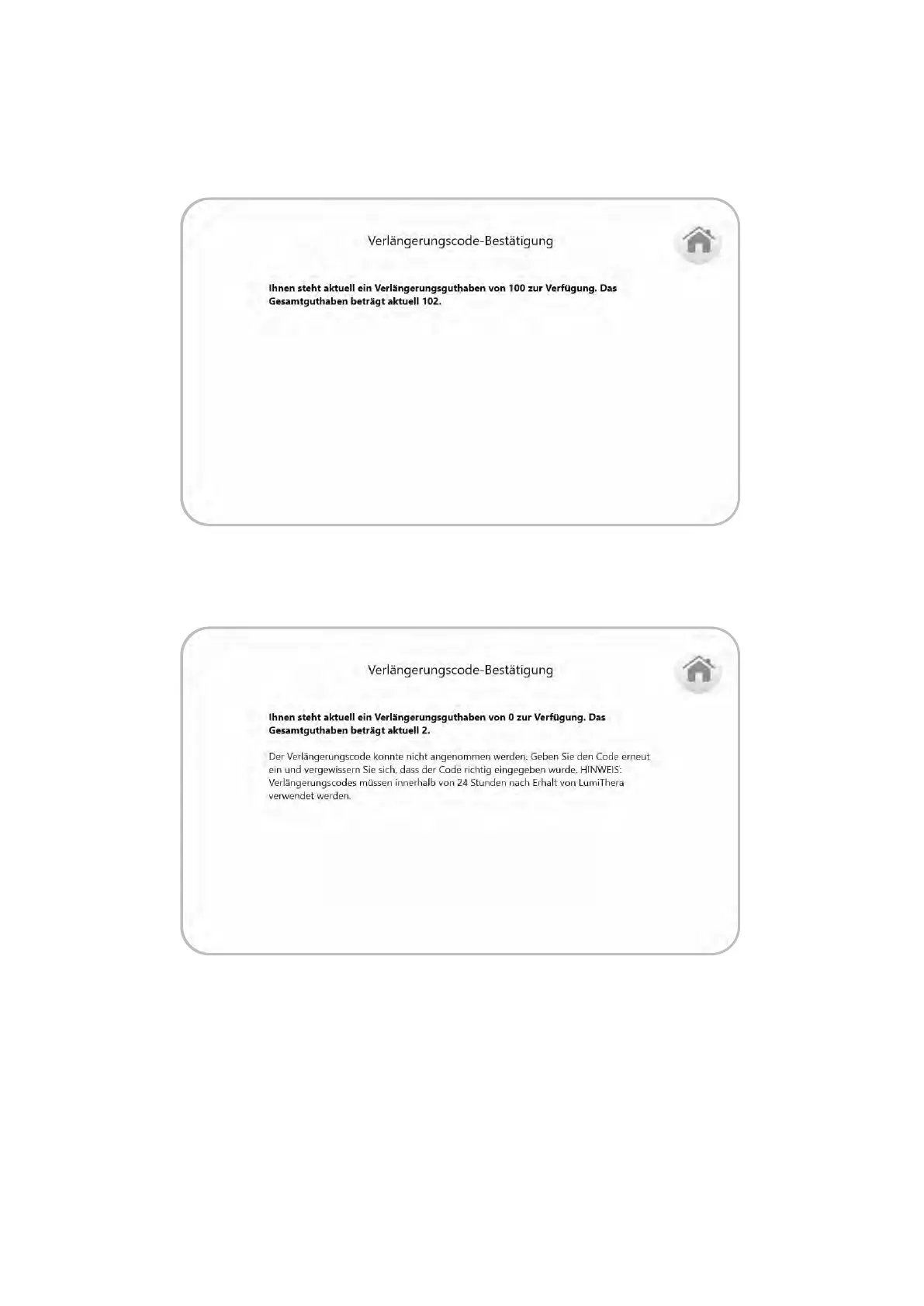 Wenn der Verlängerungscode angenommen wurde, erscheint ein Bestätigungsbildschirm mit