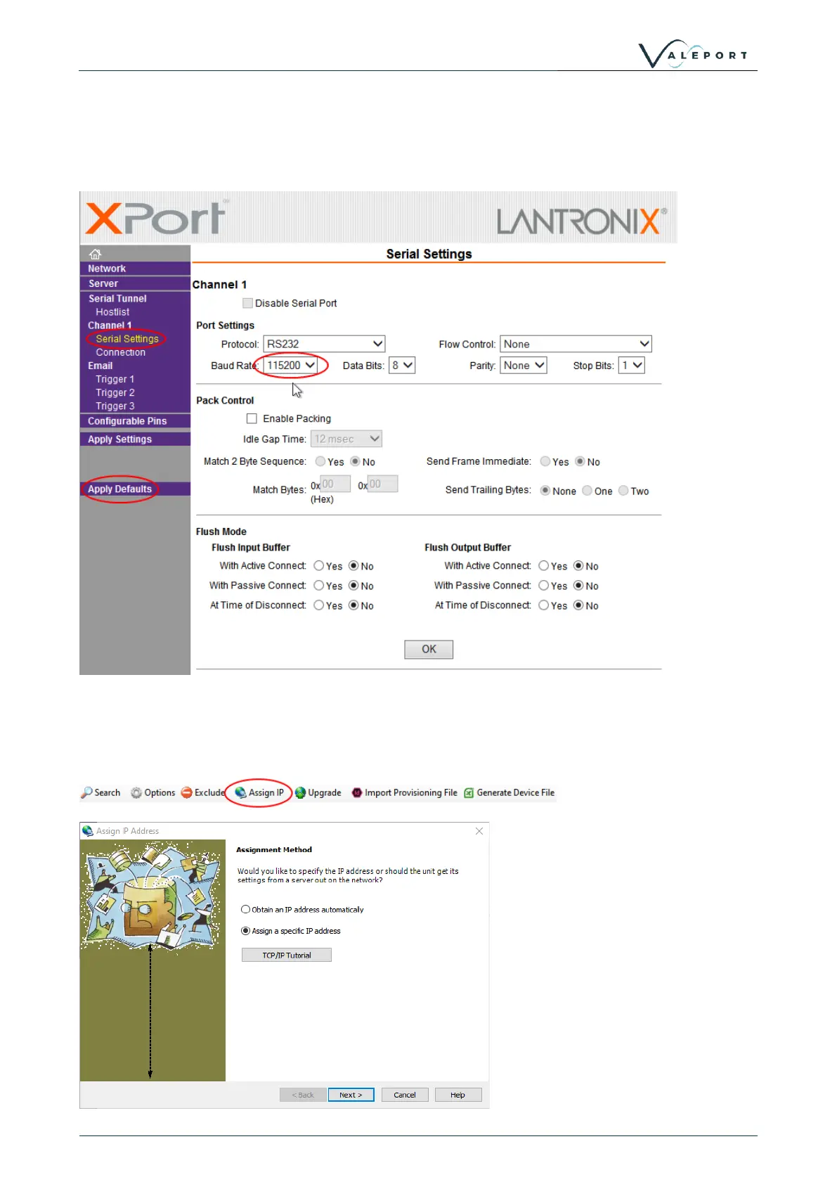 Select Serial settings, Set Baud Rate on Channel 1 to 115200