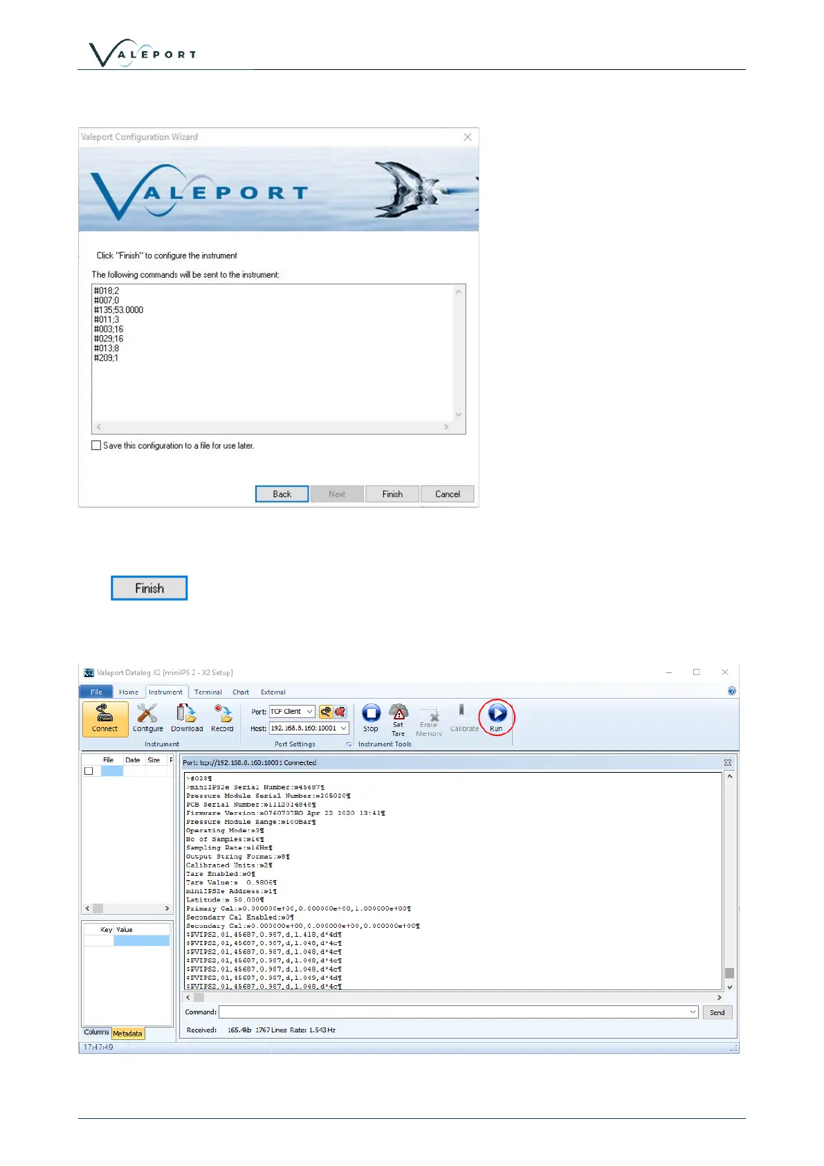 You can see the #028 command to set the instrument into run mode followed by the header and then data.