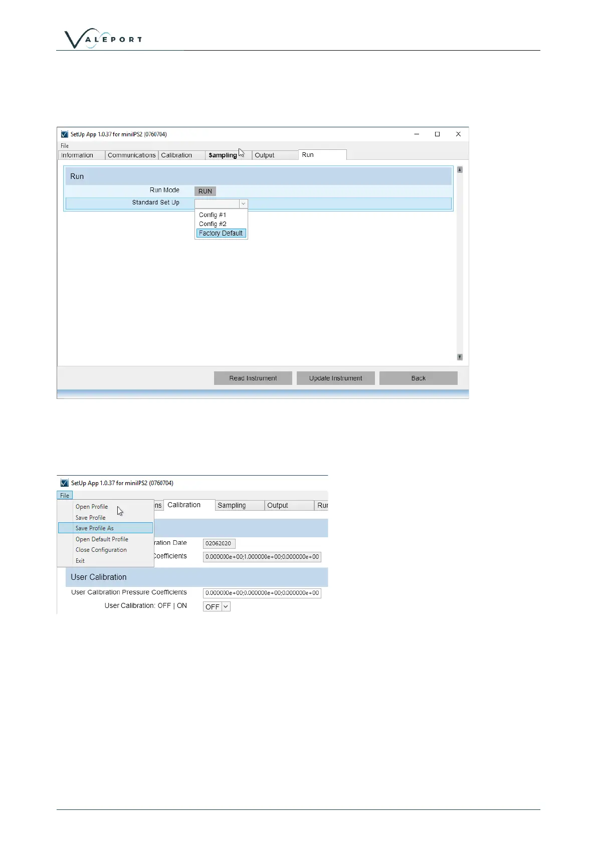 There is also the option to load predefined setup options, including a factory default – contact Valeport for