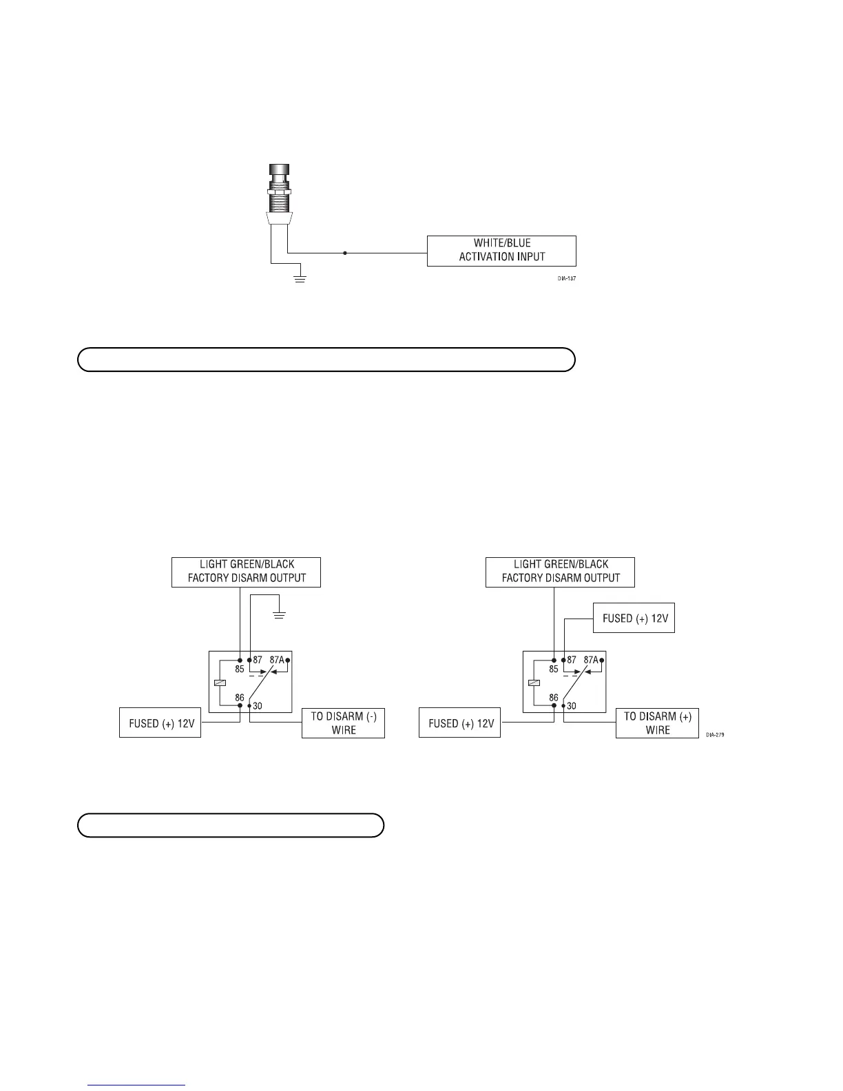 wire of the vehicle's factory anti-theft device. Use a relay to send a (-) or (+) pulse to the disarm wire as shown