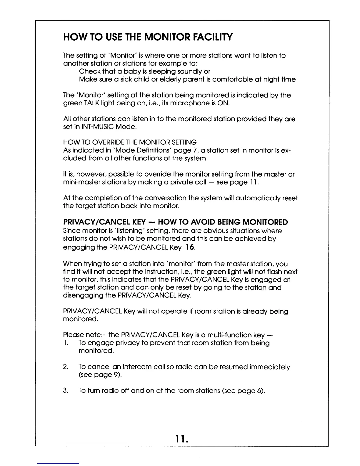Valet VM2000 - Monitor Facility Usage; Activating the Monitor Setting; Overriding Monitor Settings; Privacy Cancel Key Functions Explained