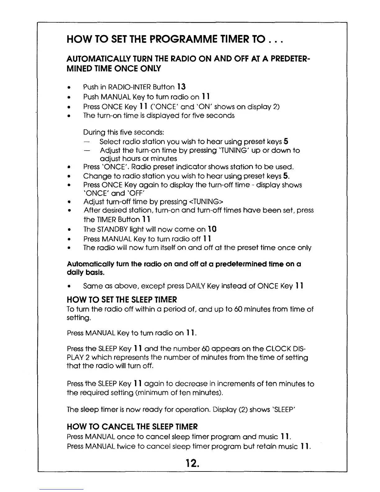 Valet VM2000 - Timer Settings for Radio Operation; Setting the Automatic Radio Timer (Once); Setting the Automatic Radio Timer (Daily); Setting the Sleep Timer for Radio