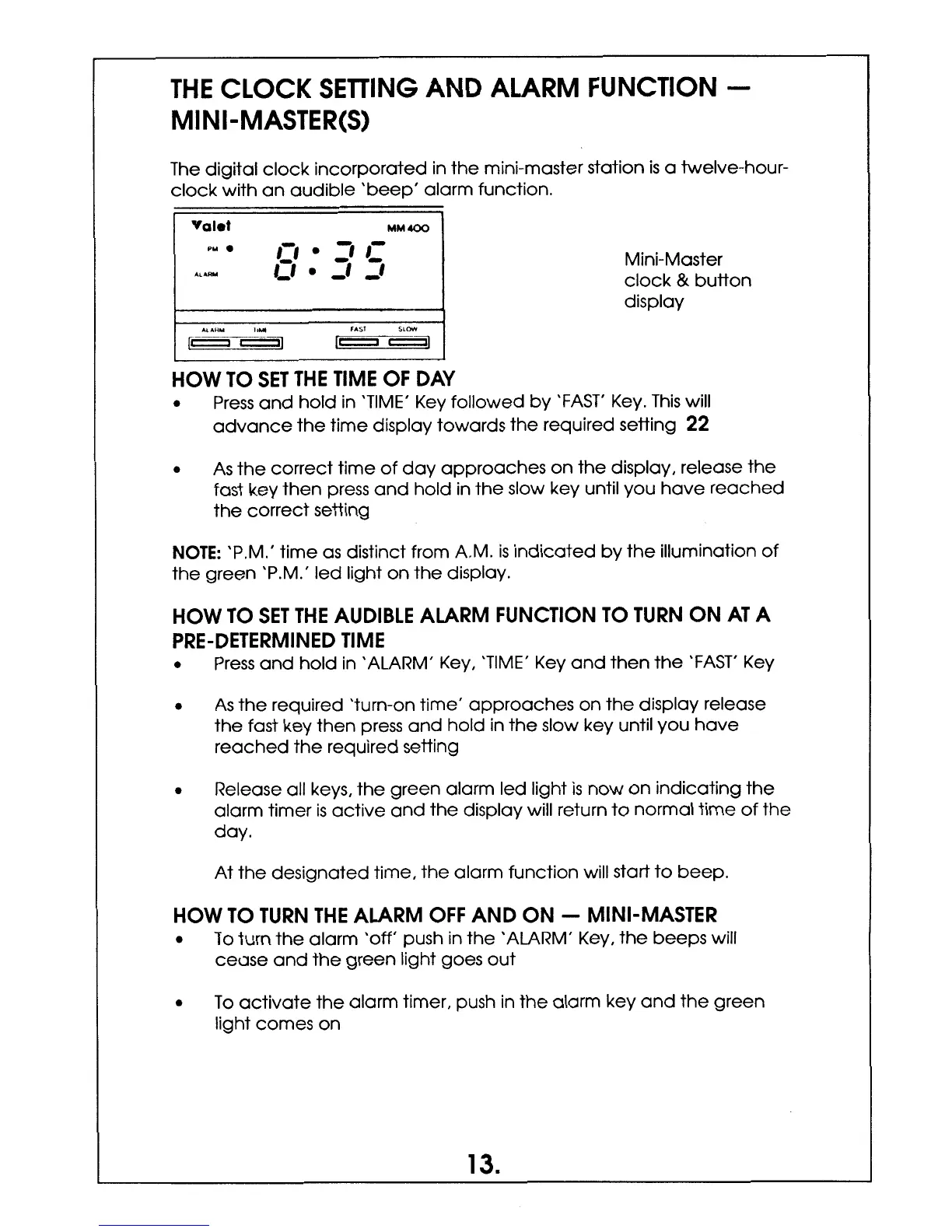 Valet VM2000 - Mini-Master Clock and Alarm Features; Setting the Mini-Master Time of Day; Setting the Mini-Master Audible Alarm; Managing Mini-Master Alarm On;Off