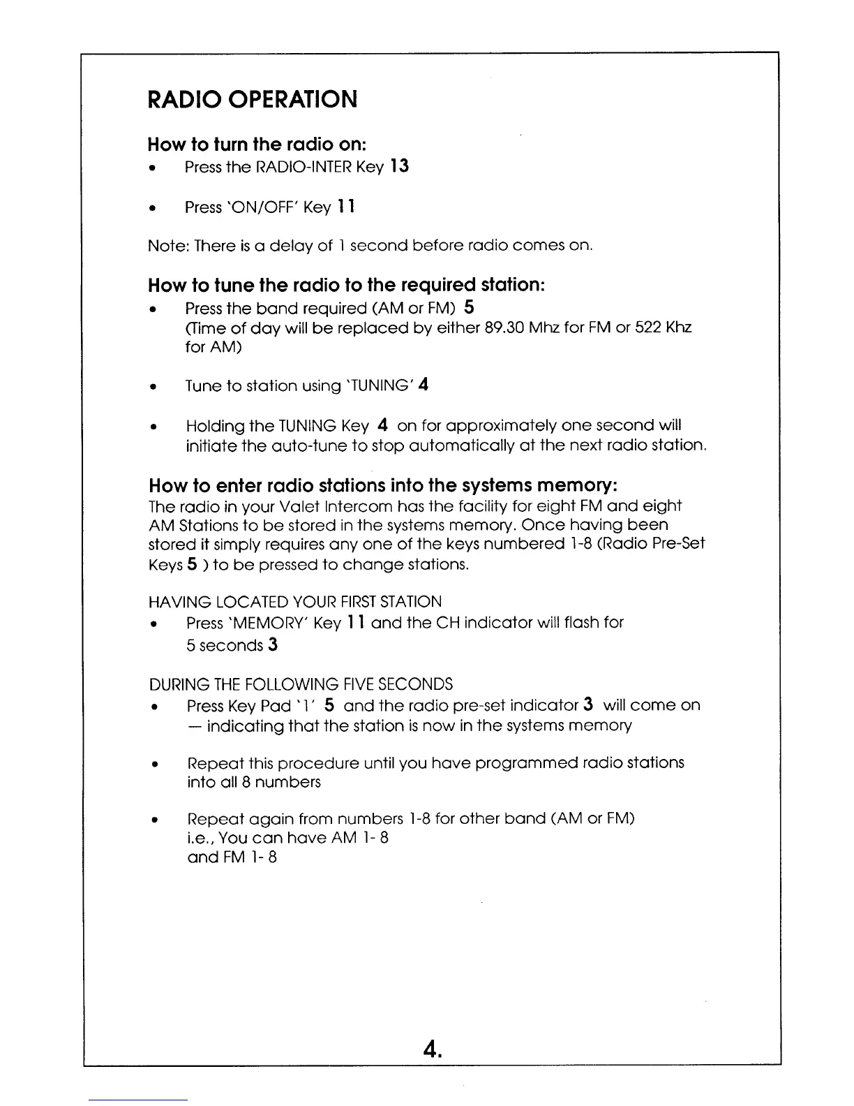 Valet VM2000 - Radio Operation Guide; Turning Radio On and Off; Tuning and Selecting Radio Stations; Storing Preset Radio Stations