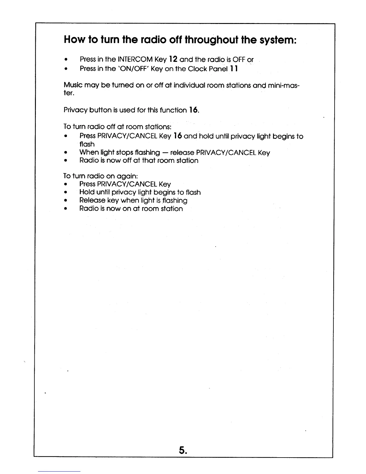 Valet VM2000 - Radio Control and Privacy Features; Turning Radio Off at Room Stations; Using the Privacy Function