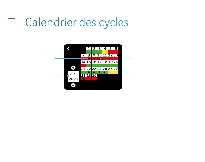 Dans le calendrier des cycles, tu peux consulter l’historique des