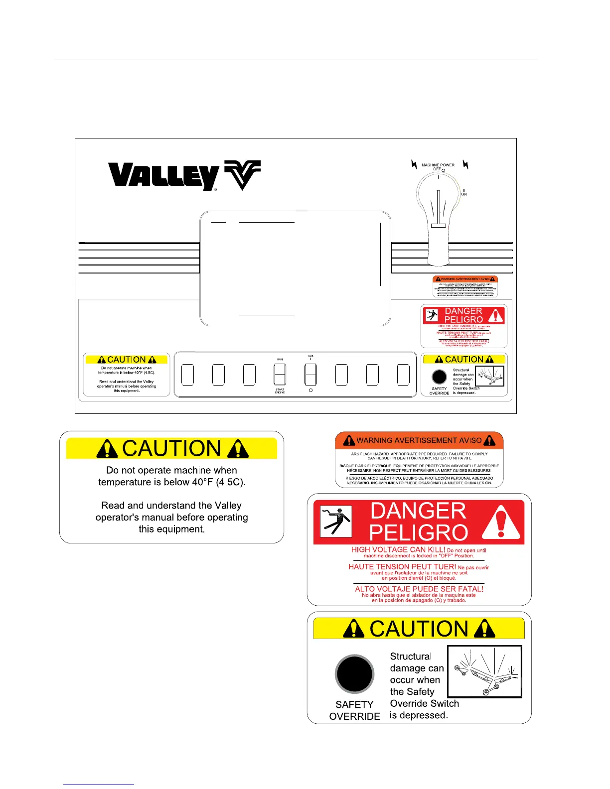 These Danger, Warning, and Caution decals appear in various locations on a Valley irrigation machine. You