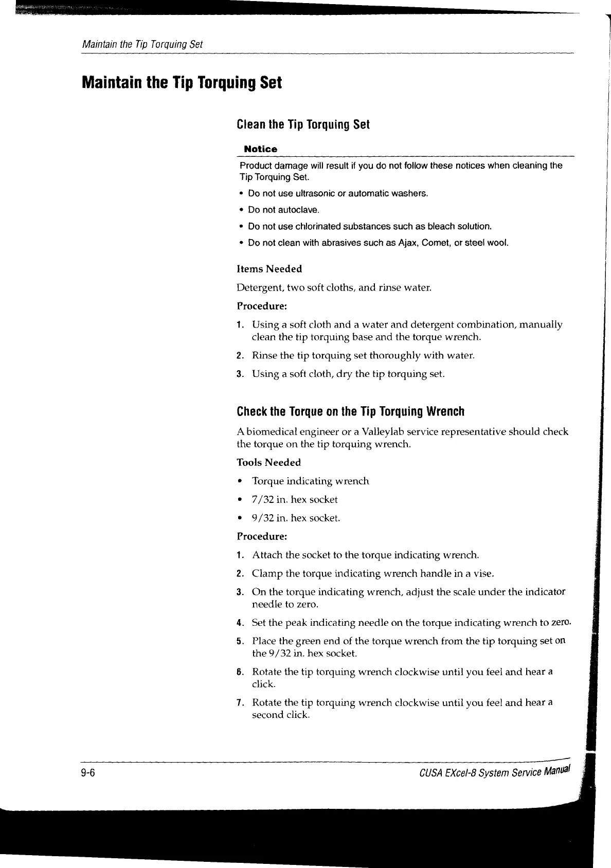 Valleylab CUSA EXcel-8 - Check the Torque on the Tip Torquing Wrench; Clean the Tip Torquing Set; Maintain the Tip Torquing Set
