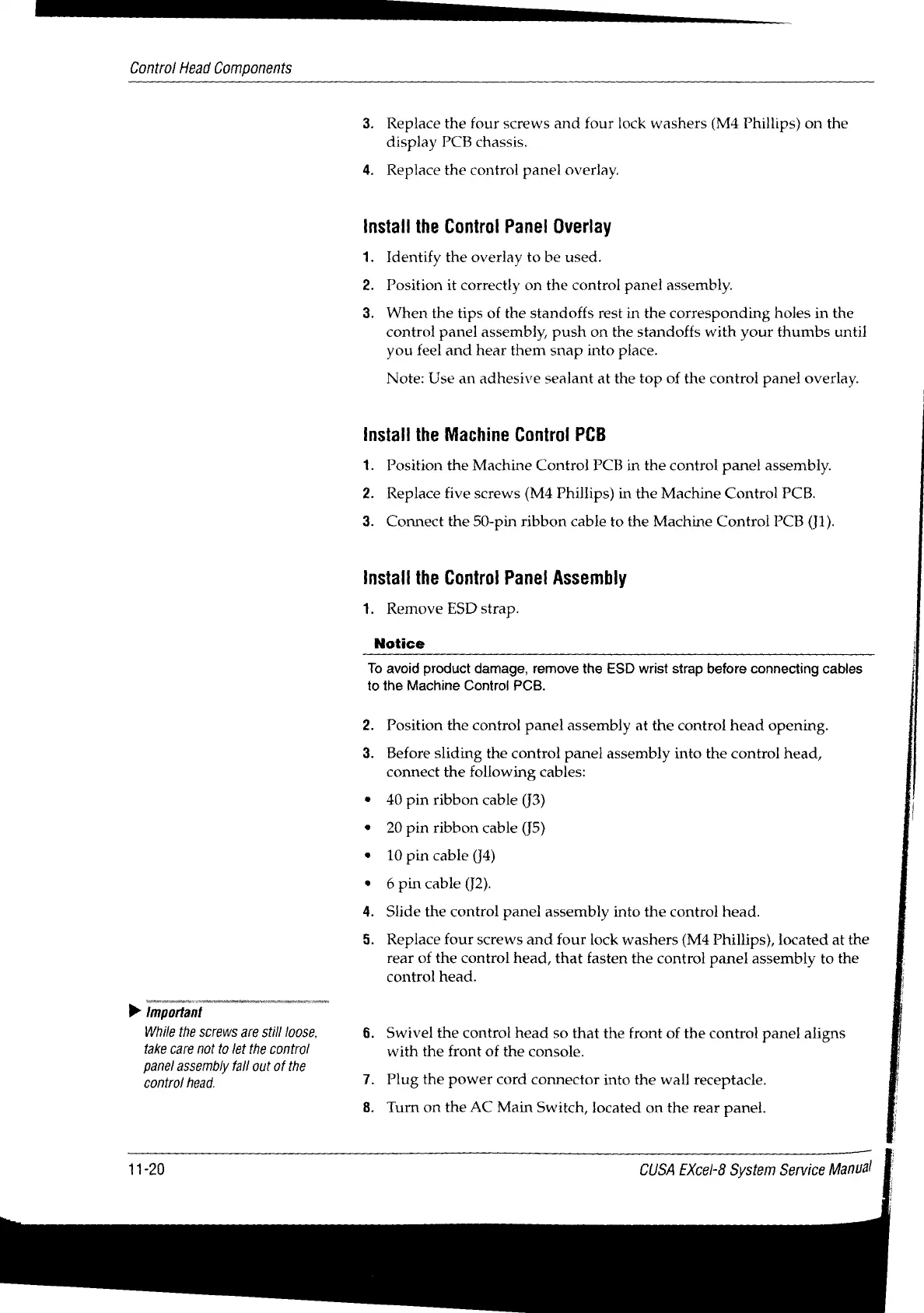 Valleylab CUSA EXcel-8 - Install the Control Panel Assembly; Install the Control Panel Overlay; Install the Machine Control PCB O