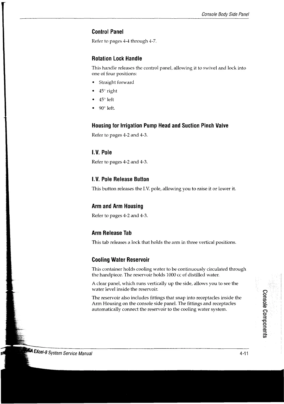 Valleylab CUSA EXcel-8 - Arm and Arm Housing; Arm Release Tab; Control Panel; Cooling Water Reservoir