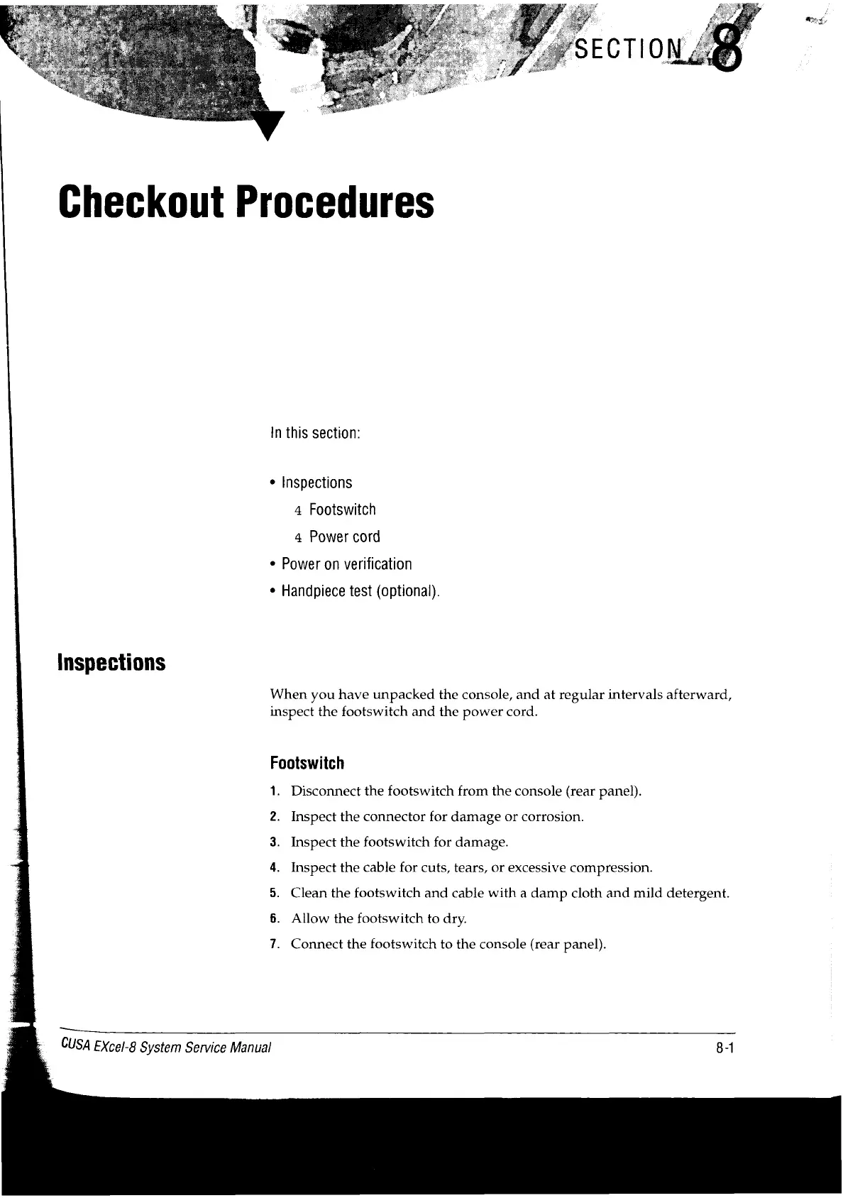 Valleylab CUSA EXcel-8 - Checkout Procedures; Footswitch; Inspections; Power Cord