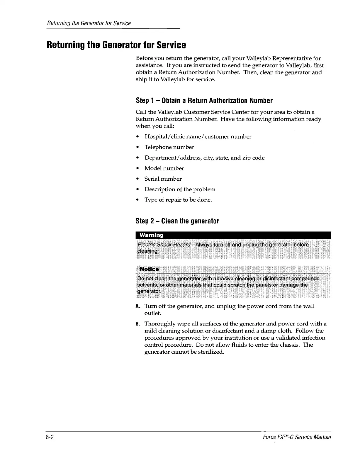 Valleylab Force FX-C - Returning the Generator for Service; Obtain a Return Authorization Number; Clean the Generator