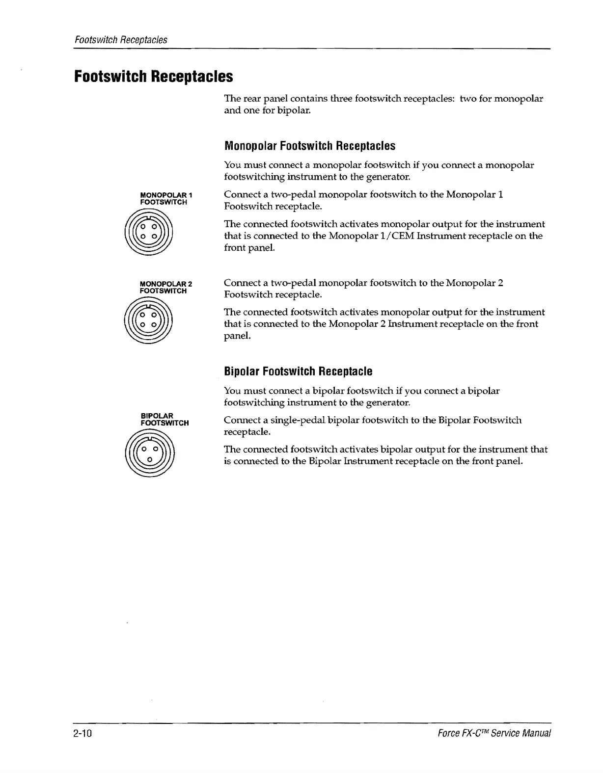Valleylab Force FX-C - Footswitch Receptacles 2·10; Monopolar Footswitch Receptacles 2·10; Bipolar Footswitch Receptacle 2·10