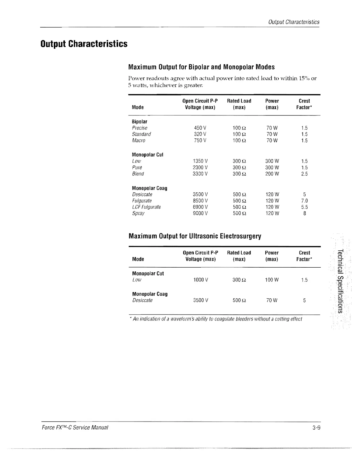 Valleylab Force FX-C - Output Characteristics; Maximum Output for Bipolar and Monopolar Modes; Maximum Output for Ultrasonic Electrosurgery