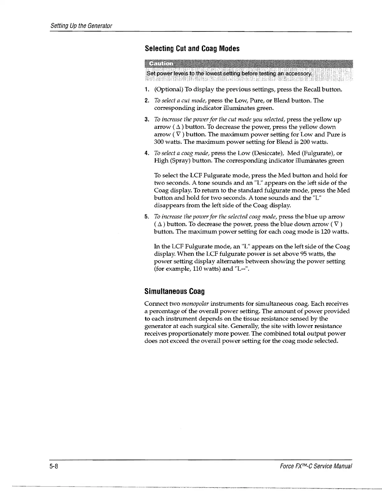 Valleylab Force FX-C - Selecting Cut and Coag Modes; Simultaneous Coag