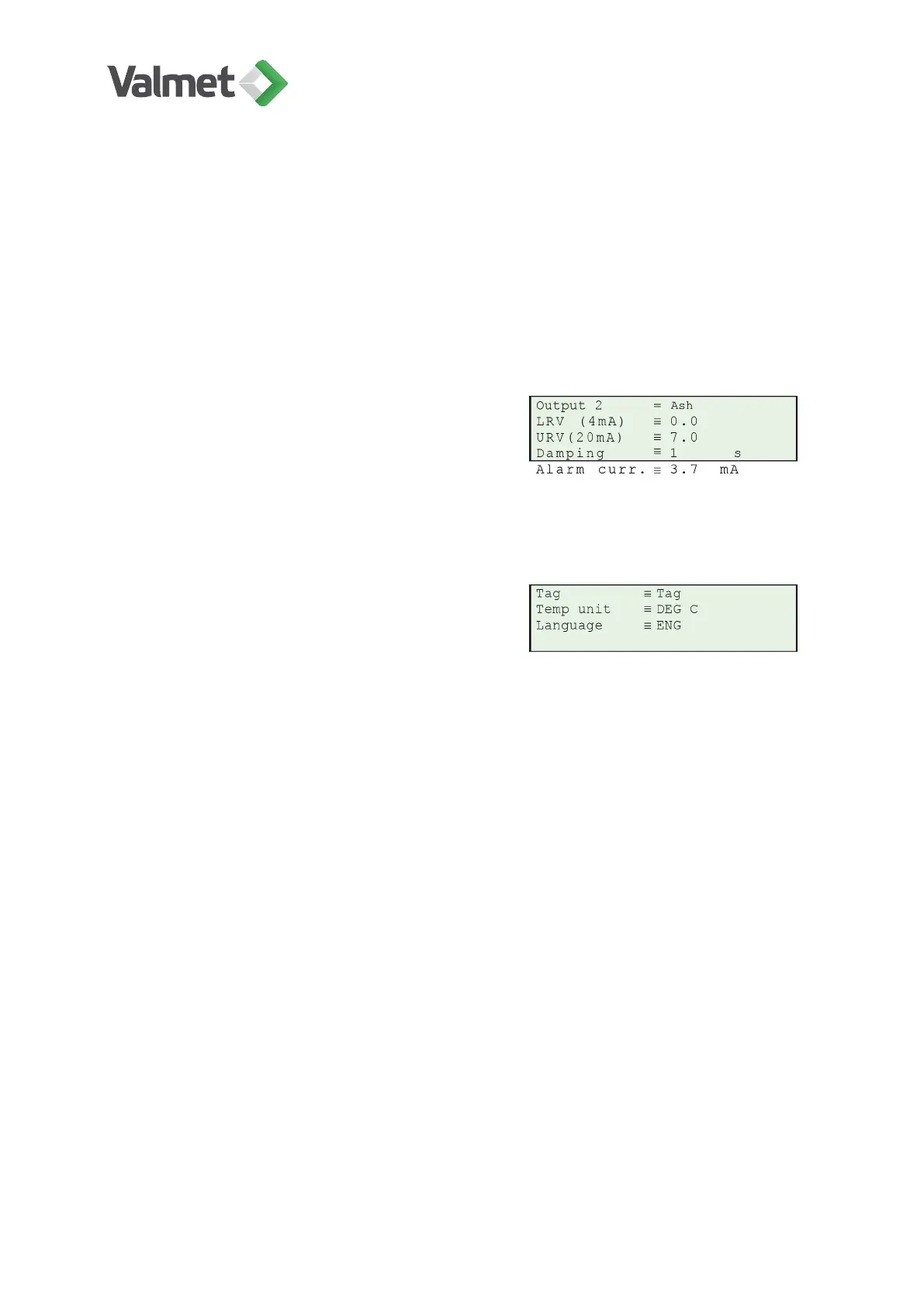 Alarm current: Analog output current to indicate device failure. Possible values are 3.7