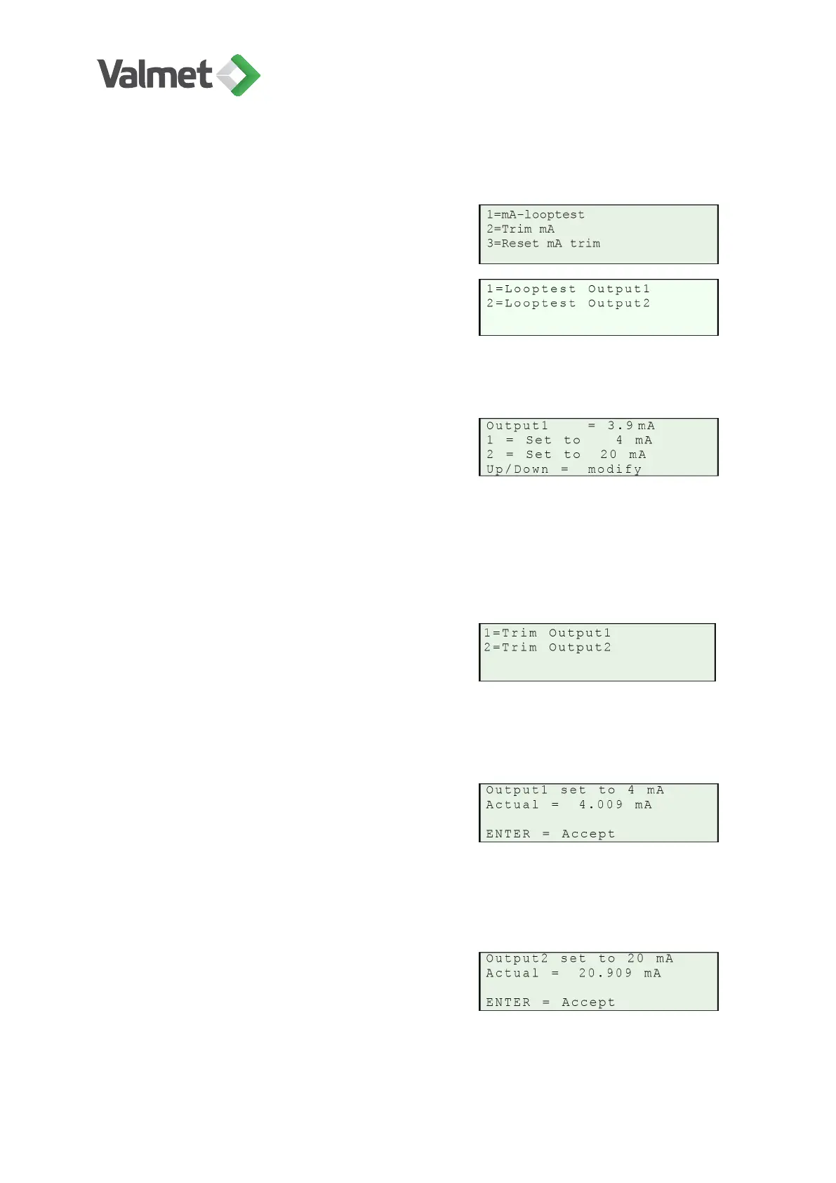 Trim mA: 1, 2: Select "Trim Output1/Output2".
