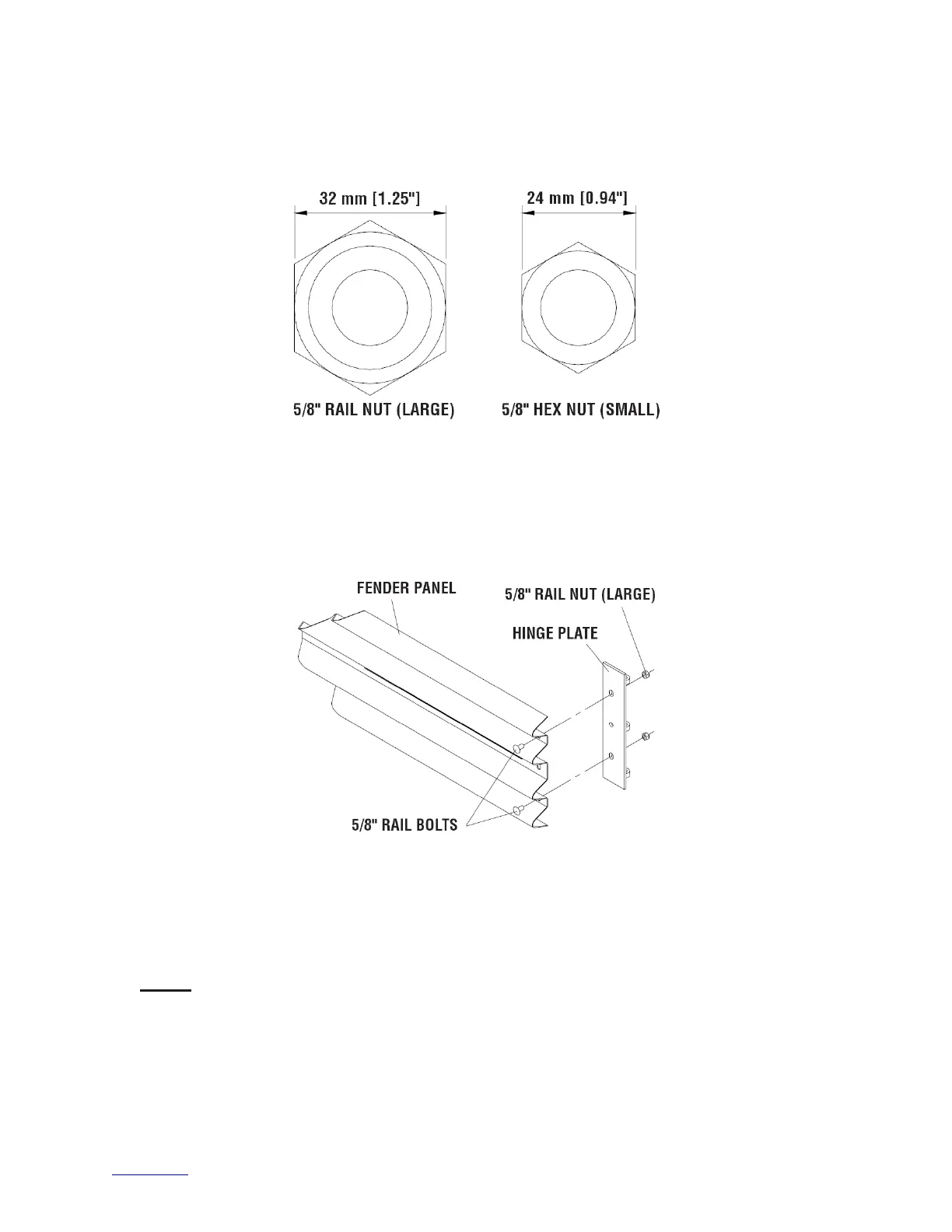 Attach Hinge Plate on each Fender Panel using two (2) 5/8” rail bolts and two (2) 5/8” rail nuts,