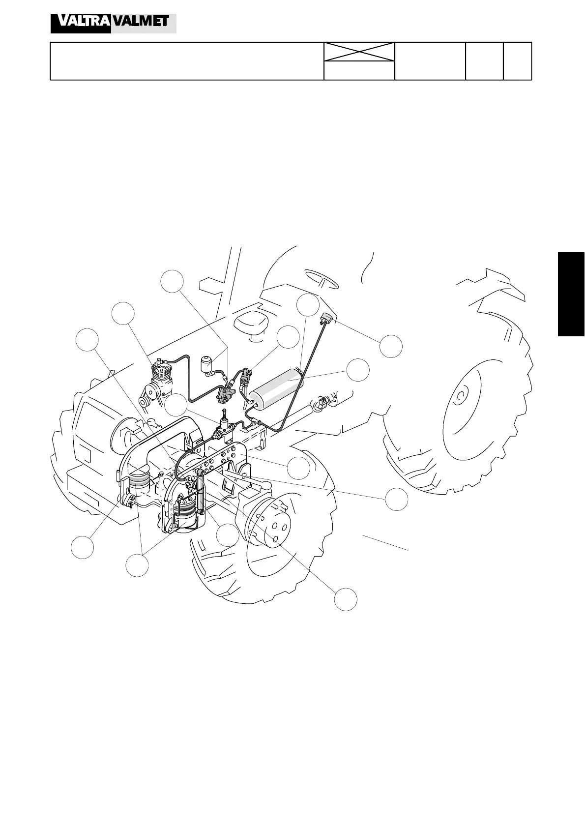 The front axle air suspension (option) is available for 6200---8950 tractors. The foremost components of the system (com-